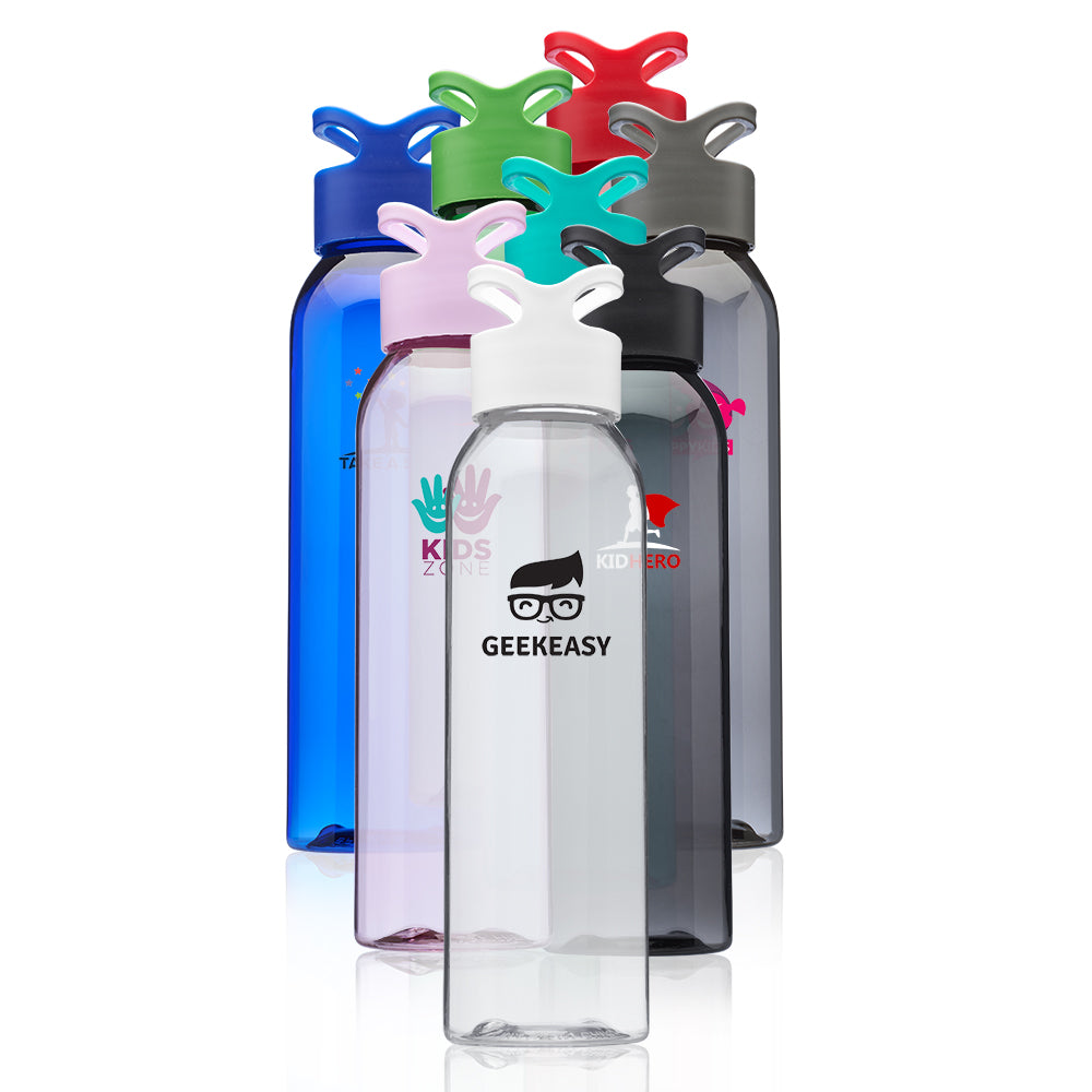 Made with durable Tritan plastic, these custom water bottles feature a funky screw on cap that will get t the attention of your audience. Great for trade shows, promotional giveaways, sporting events and the like, they're available in color options that include white, teal, blue, lime green and red, and hold up to 22 ounces water or your favorite hydrating drink. 2.5" W x 10" H