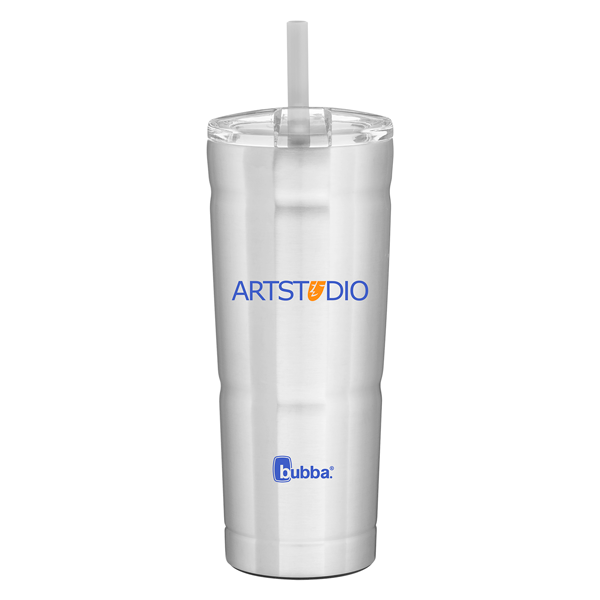 24 oz double wall stainless steel thermal tumbler with vacuum insulation, Eastman Tritan copolyester push-on lid with thumb tab, straw with stopper, silicone base pad, and rubberized finish.