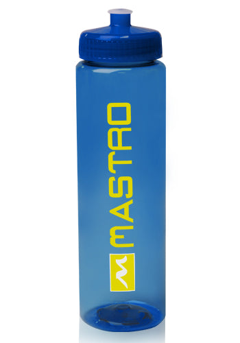 These Poly-Clear plastic water bottles are available in your choice of transparent blue, green, red, purple, some and clear. These feature a tall cylindrical body that holds up to 32 fluid ounces of water or your favorite power drink, matching screw on caps with contrasting white push-pull lid, and are made in USA with recyclable PET plastic.