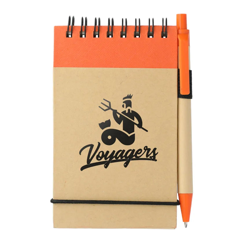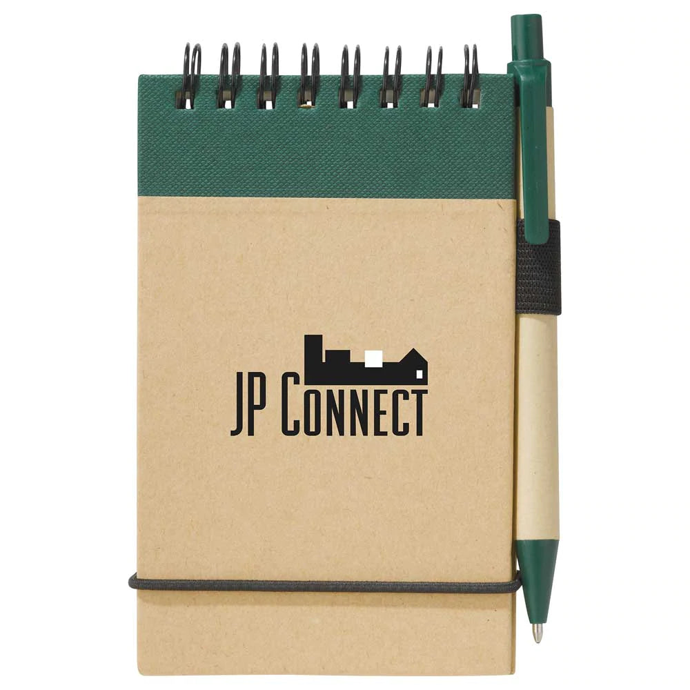 The 5" x 4" Recycled Jotter with Pen features a recycled cover and includes a matching recycled barrel ballpoint pen. It also features a plastic band closure a pen loop and 60 ruled pages. A pen imprint is not available and pens are packed separately. Through a partnership with 1% For The Planet one percent of sales of this and all EcoSmart products will be donated to nonprofits dedicated to protecting the planet.