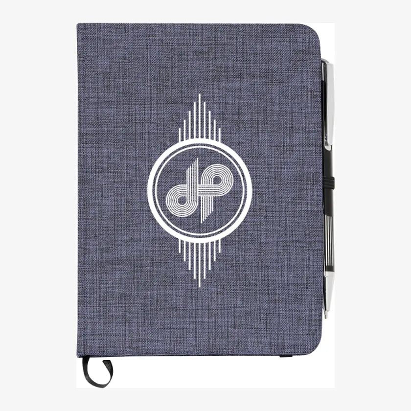 The 5" x 7" Heathered Bound Notebook is a heathered canvas covered bound notebook with 80 sheets of white lined paper. Elastic pen loop included.