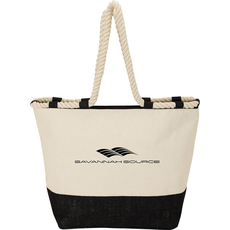 The Barcelona 10 oz. cotton canvas tote features laminated interior, colored jute trim and bottom, zippered closure, a 7" gusset, and thick nautical-style 23" rope handles.