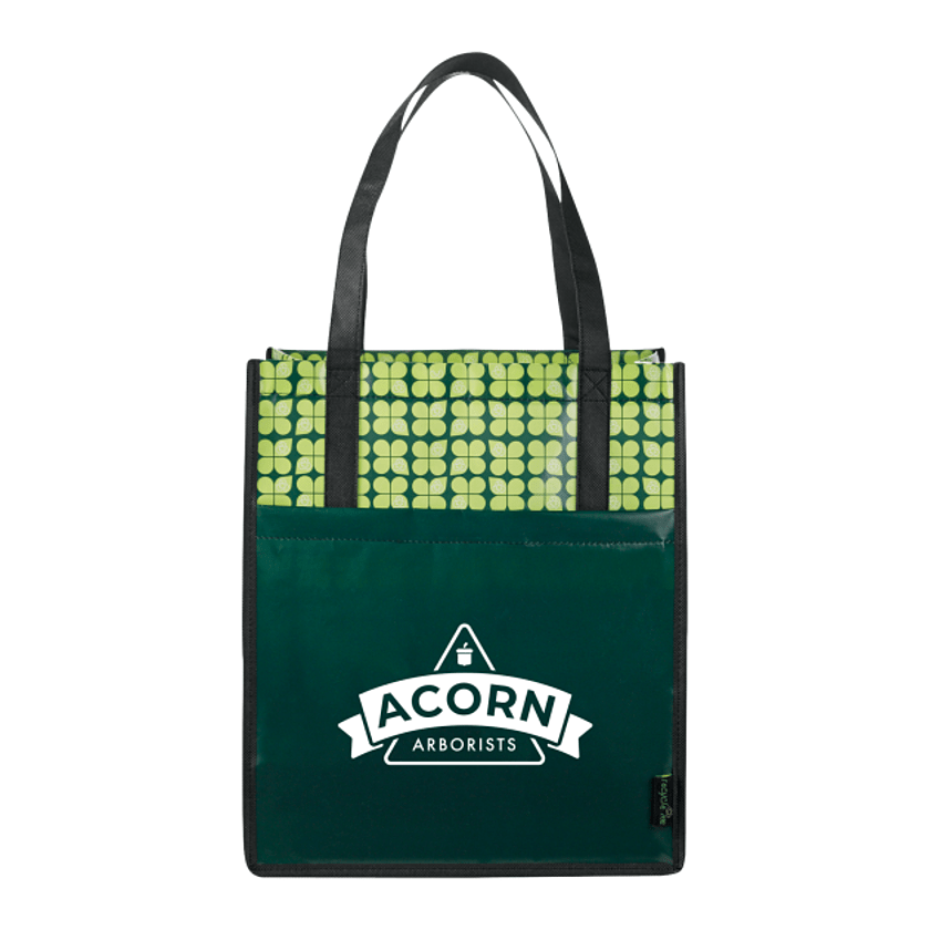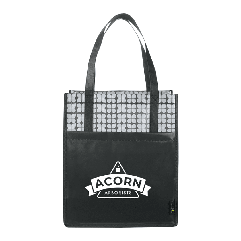 Eco-print pattern supports environmentally friendly promotions and is also ideal for grocery shopping, beach trips and other outdoor events. Perfect alternative to plastic bags. Large main open compartment. Supportive bottom board. Open front pocket. Laminated material is water-resistant and easily wipes clean. Polypropylene non-woven reinforced handles and binding for added durability. 10" handle drop height.