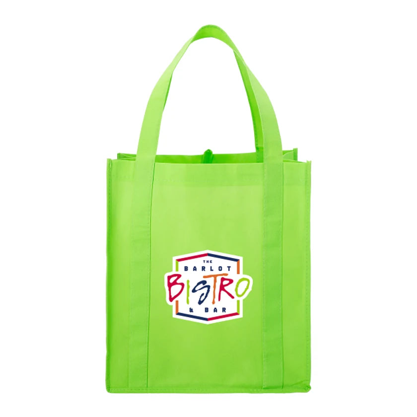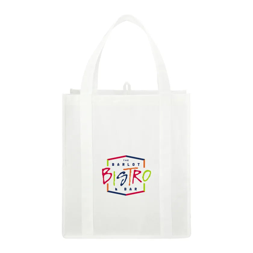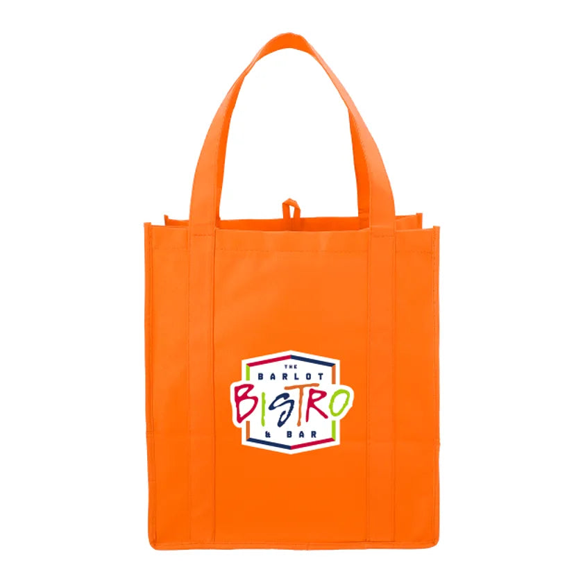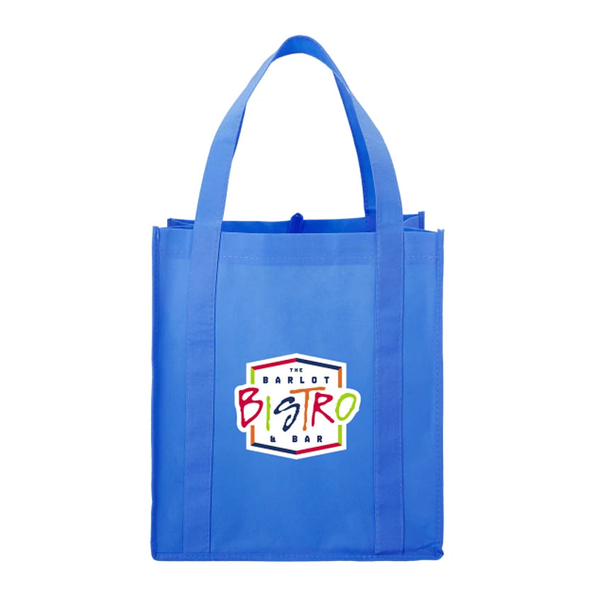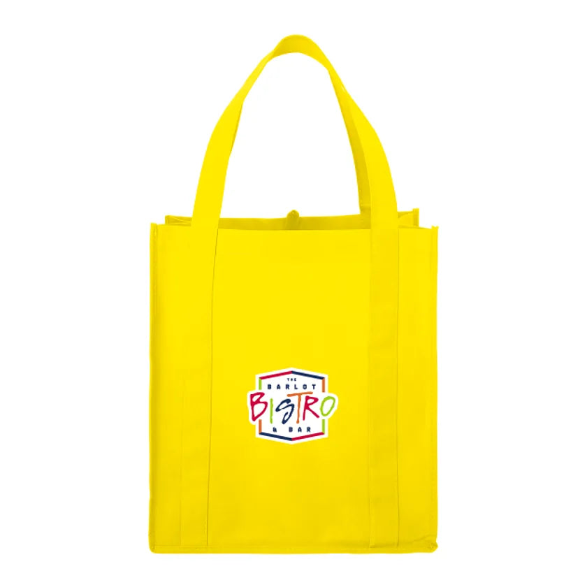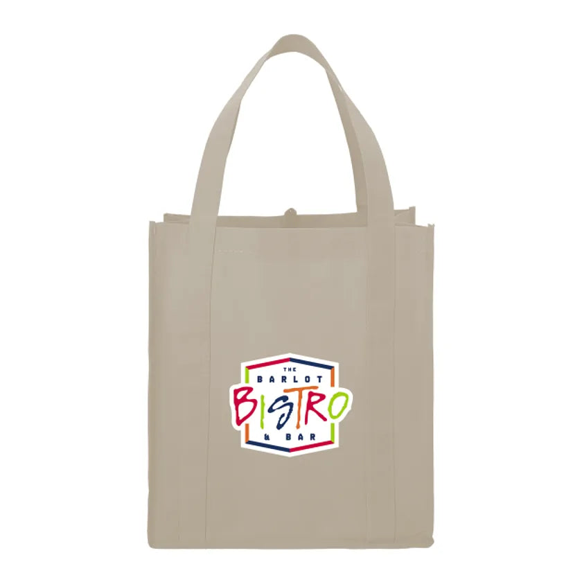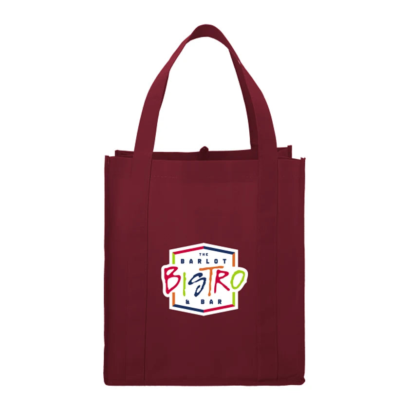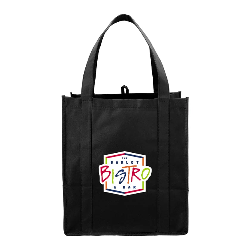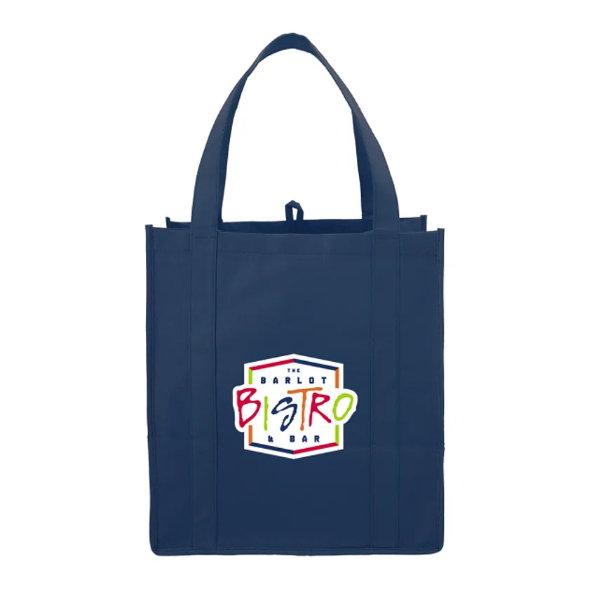 Perfect alternative to plastic bags. Open main compartment. Supportive bottom board. Reinforced binding on edges. Interior fabric loop at opening for attaching bag to supermarket checkout frames. Reinforced handles and binding for added durability. 9.25" handle drop height. Gusset & Handle Decorating is Transfer/PhotoGrafixx Only and does not qualify for SureShip.