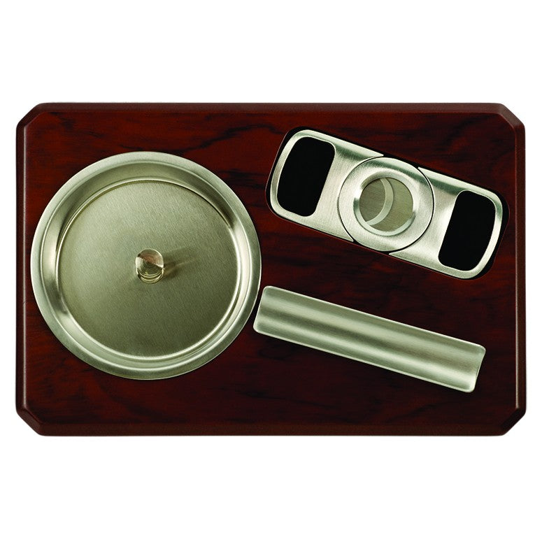 Inlaid into the wood base (8-3/4" X 5-7/8" X 3/4") are three 18/0 stainless steel components: a removable 3-7/8 inches dia. ashtray, a twin-blade 58-cigar ring gauge cigar cutter and a removable curved cigar holder. All pieces are held into the wood base by magnets.