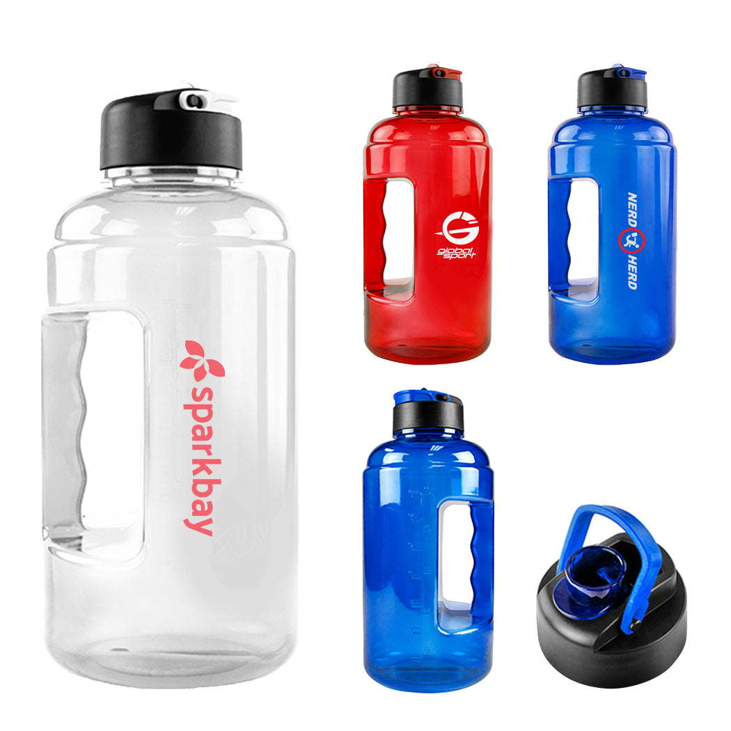 This half gallon titan is perfect for university, gym, or marathon giveaways. Available in three transparent colors, the jug features a side grab handle, a flip up drinking spout that matches the body color, and a small matching color top carry handle. BPA free. Hand wash recommended.