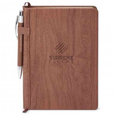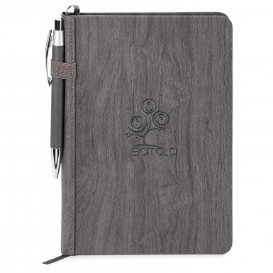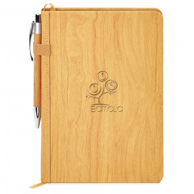 Combo includes ST455 hard cover vinyl journal with a wood grain finish, 192 ivory lined, perforated pages (non-refillable) and a matchingAsia bamboo ballpoint push-action pen. Trim made with 45% biodegradable materials. Please note that bamboo is a natural fiber, therefore noticeable shade variations and grain patterns may be apparent within orders of the same item.