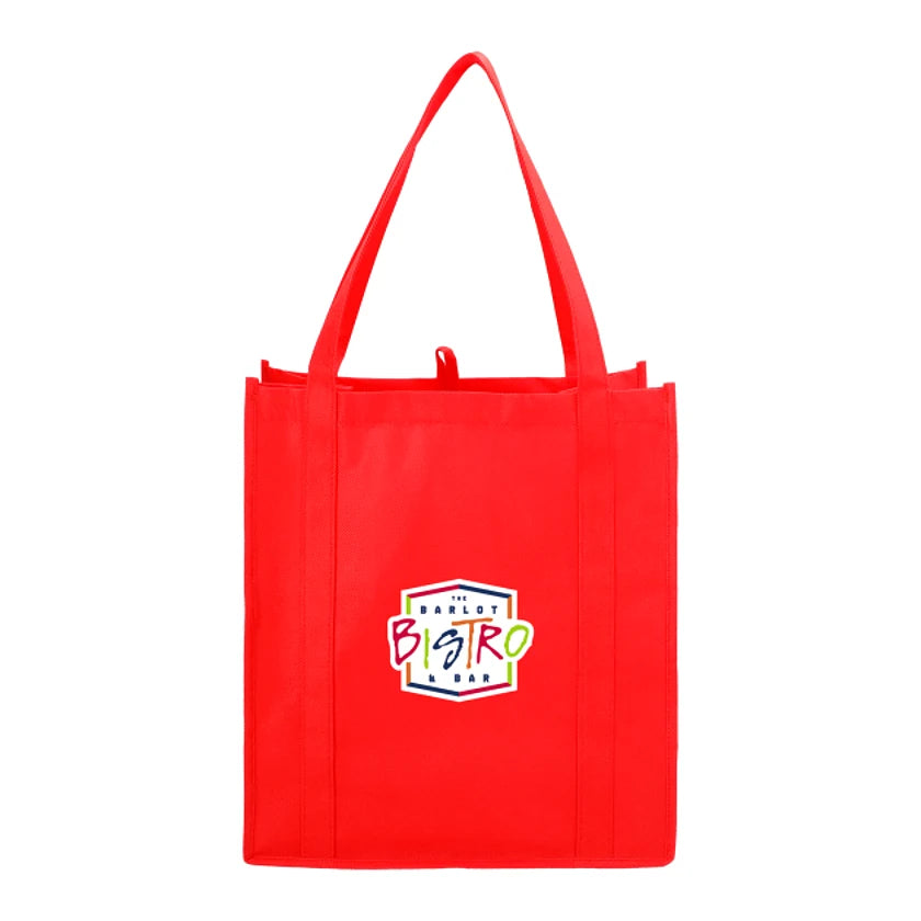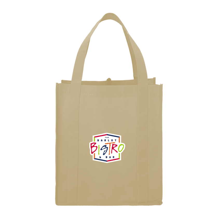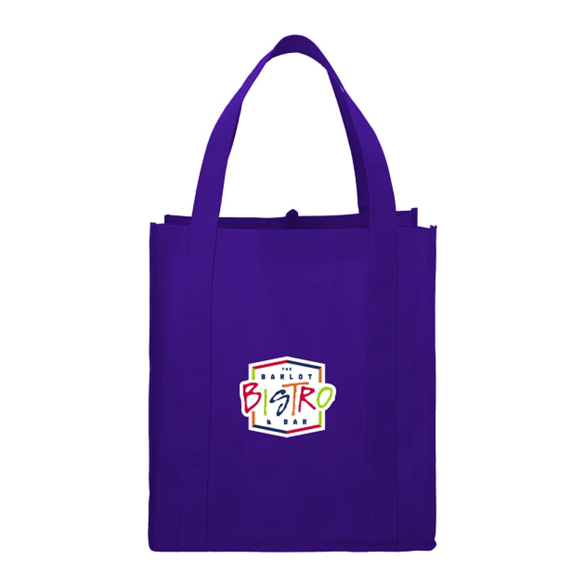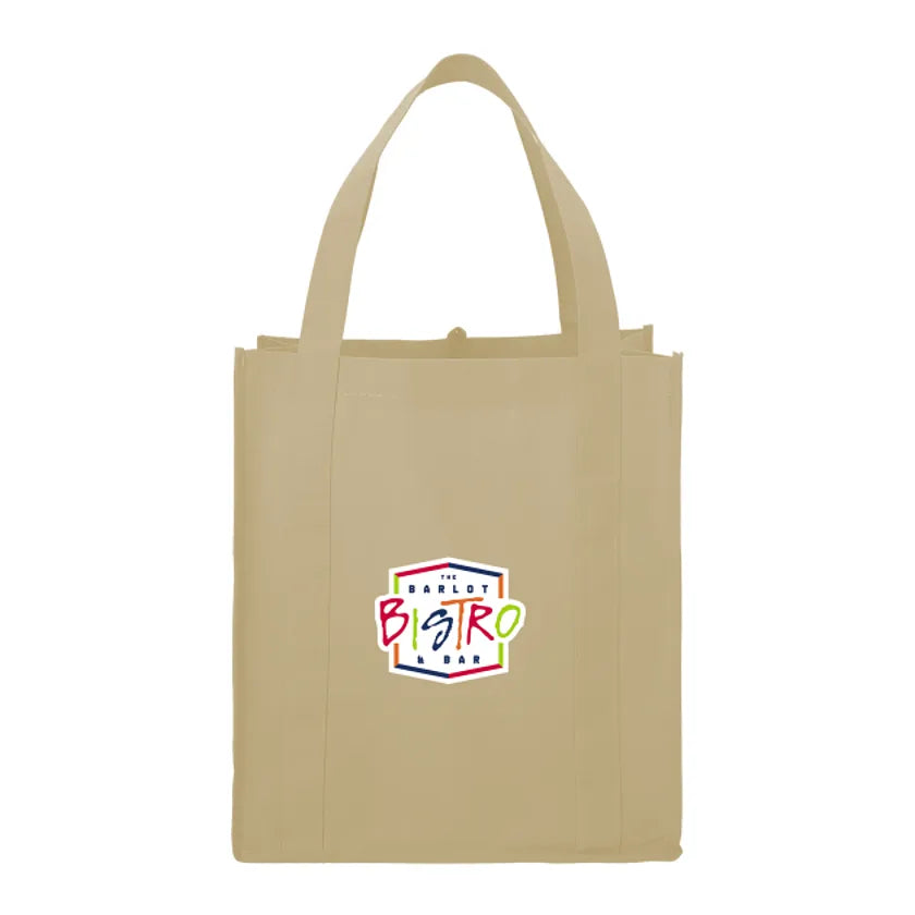 The Little Juno Non-Woven Grocery Tote features an open main compartment with double 22 inch reinforced handles and a supportive bottom board. It's also reusable and a great alternative to plastic bags. Gusset & Handle Decorating does not qualify for one day turn.
