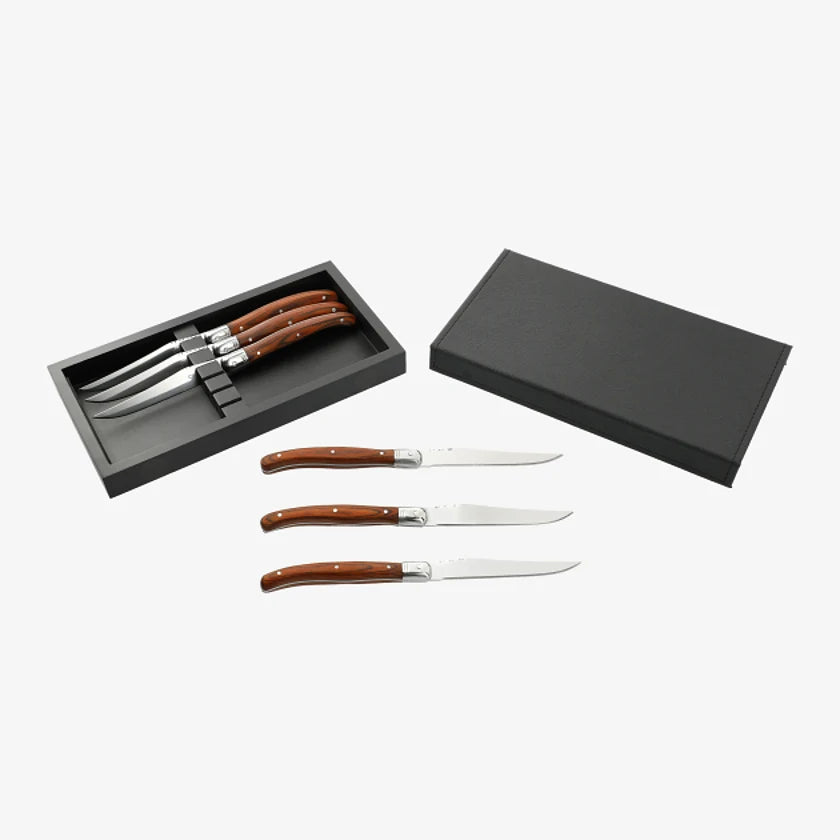 The Modena 6-Piece Steak Knife Set is a beautifully crafted six-piece knife set that is perfect for when hosting a dinner. The set comes in a wooden case that is convenient for both storage and presentation. The sharp non-serrated edges on the knives make easy work for thick steaks. Each knife measures 8.78" x 0.75" x 0.5".