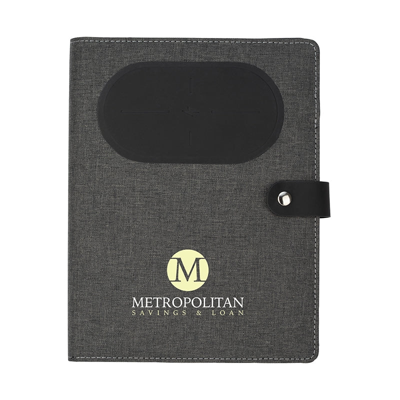 The Navigate Notebook has a wireless phone charger, a professional look and is perfect for notetaking in work meetings and conferences. It has 50 sheets of lined paper in the spiral replaceable notebook, an interior pocket for your phone or power bank, an elastic pen loop, elastic cable organizer and an interior slip pocket for notes.