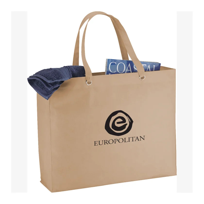 The Oak Non-Woven Shopper Tote has an open main compartment with double 23 inch handles reinforced with metal grommets. Completely reusable it's a great alternative to plastic bags.