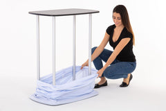 Comes with full color printed fabric graphic that slips over the collapsible counter display. |