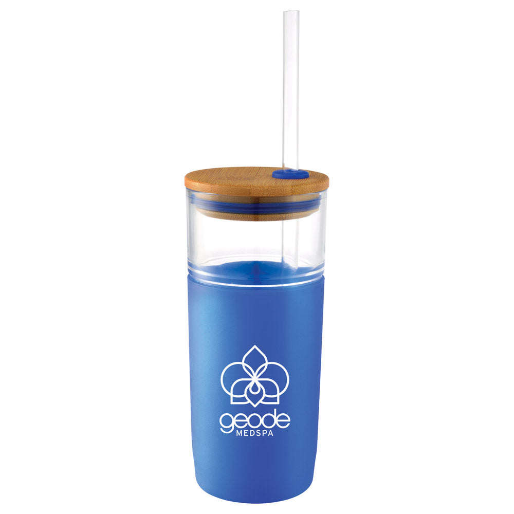 The Poppi Glass Tumbler features a push-on bamboo lid, a non-slip base to help prevent spills, and a comfortable soft-grip sleeve. It also comes with a matching Tritan straw and fits in most car cup holders.