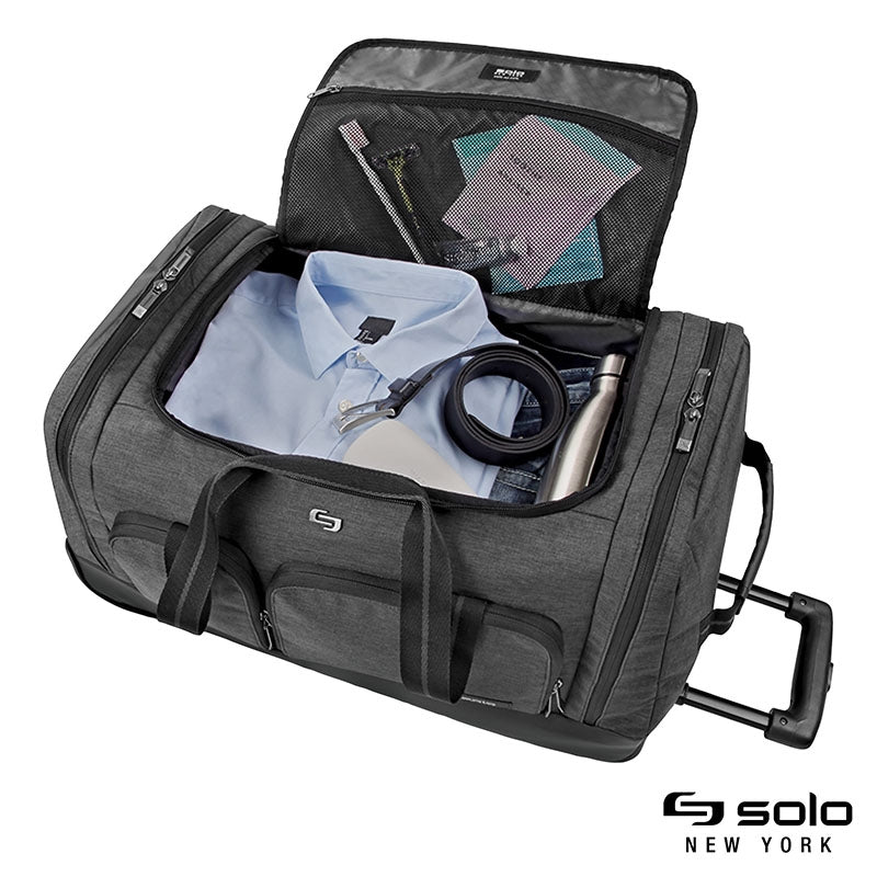Enjoy your weekend travels with the urban Leroy Rolling Duffel and carry the excitement of the city with this modern bag from the Solo® Downtown Collection. Expand your journey across continents as this bag meets carry-on requirements for most major airlines. It has a 49L capacity, two front zippered pockets and one side pocket. Keep your small essential items in the internal mesh pocket.