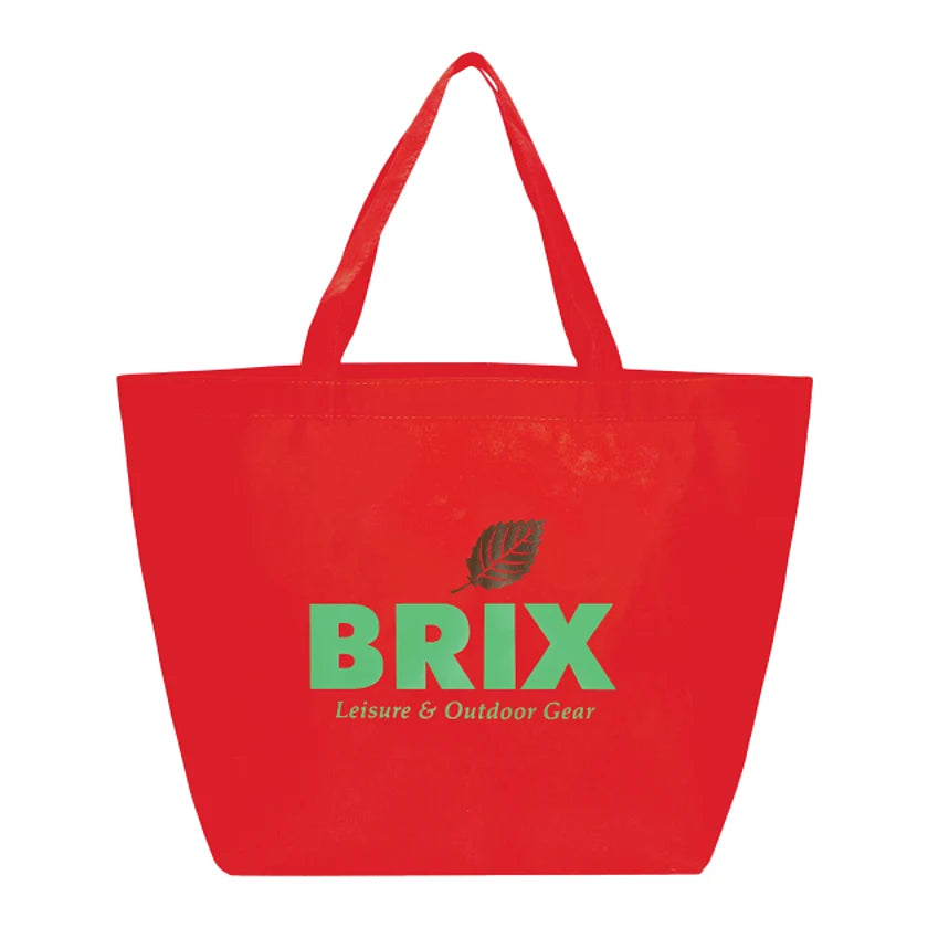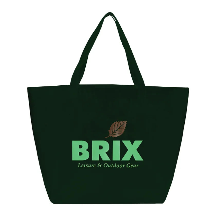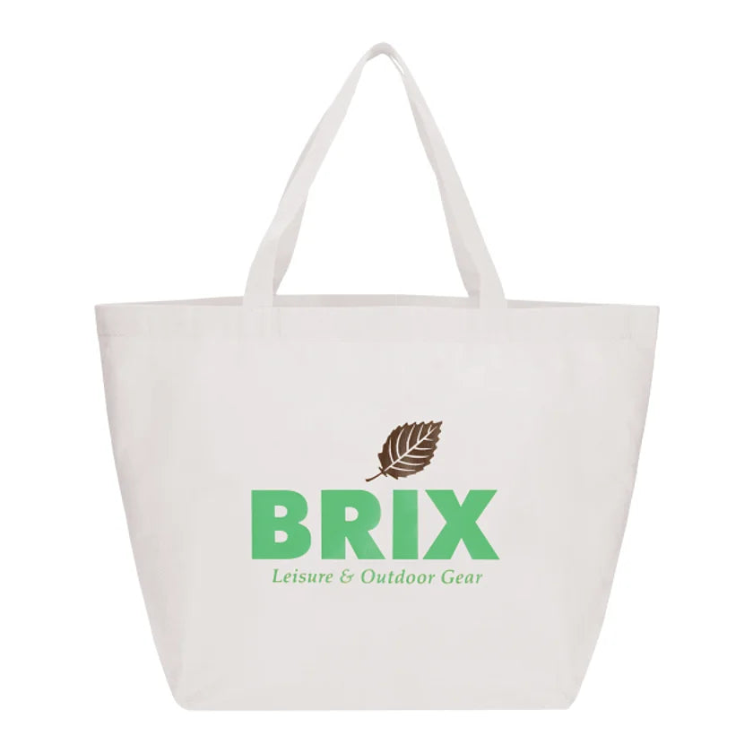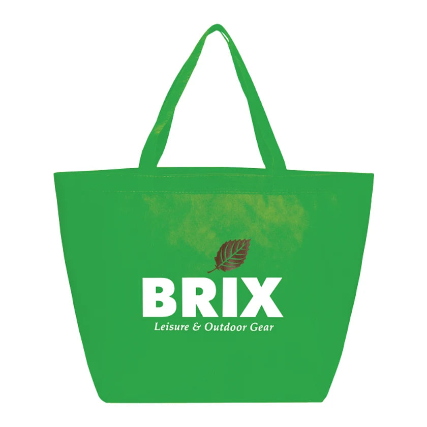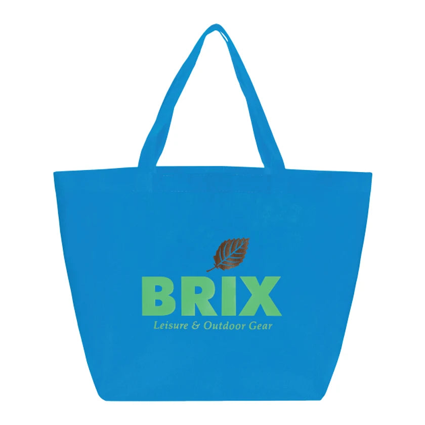 The YaYa Budget Non-Woven Shopper Tote has a large open main compartment with double 20 inch reinforced handles. It's completely reusable and a great alternative to plastic bags. Gusset & Handle Decorating does not qualify for one day turn. Bag is flared at the top and 19.5" wide when laid flat or when not fully stuffed. Bottom is 12" in width or when bag is fully stuffed.